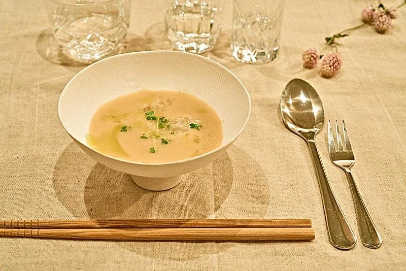 White corn potage, mitsuba oil, tenkasu, murasaki imo powder