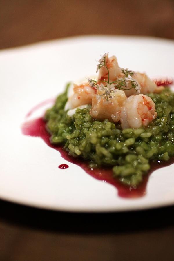 Komatsuna & saikyo miso risotto, butter grilled aka-ebi, akashiso syrup, mascarpone