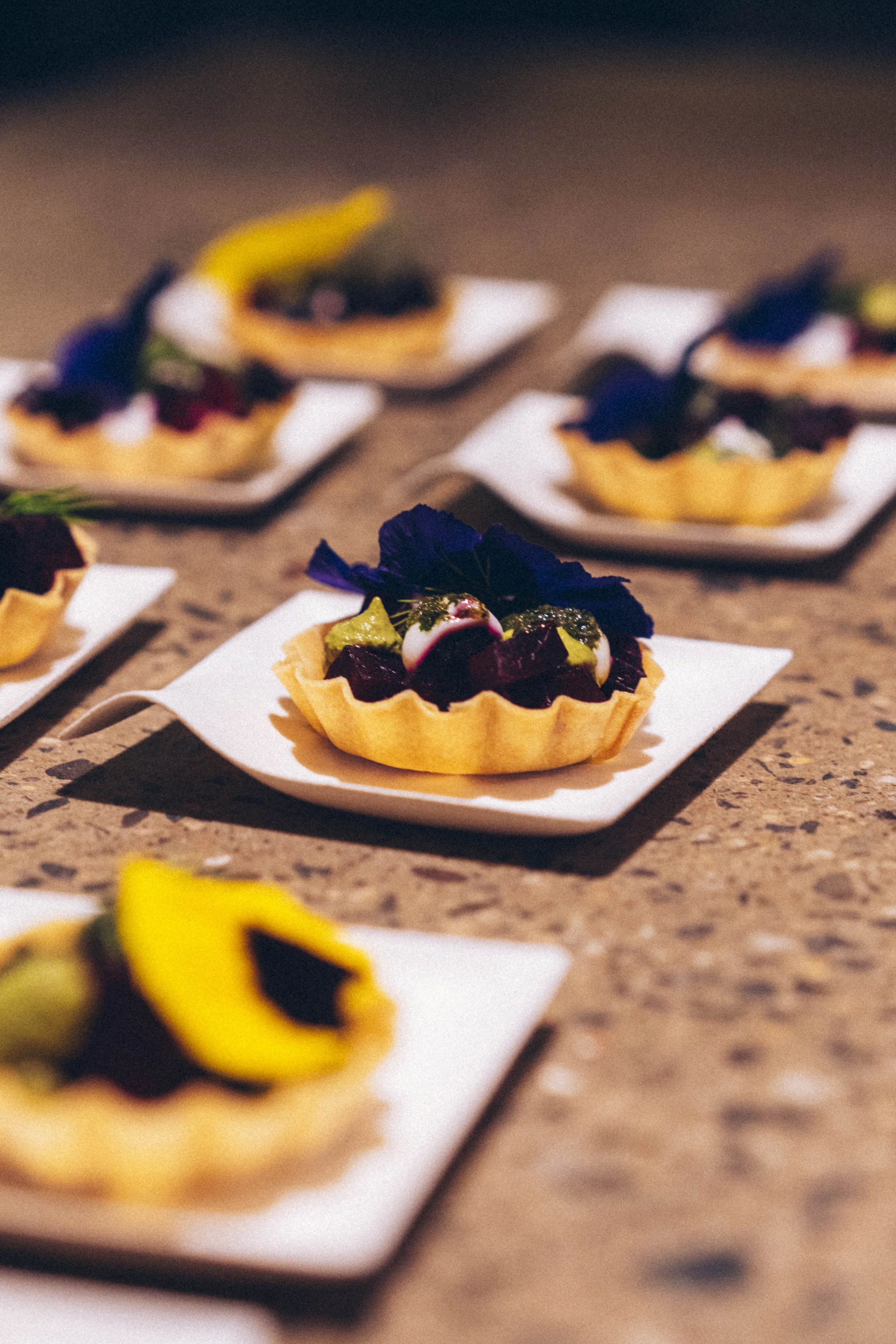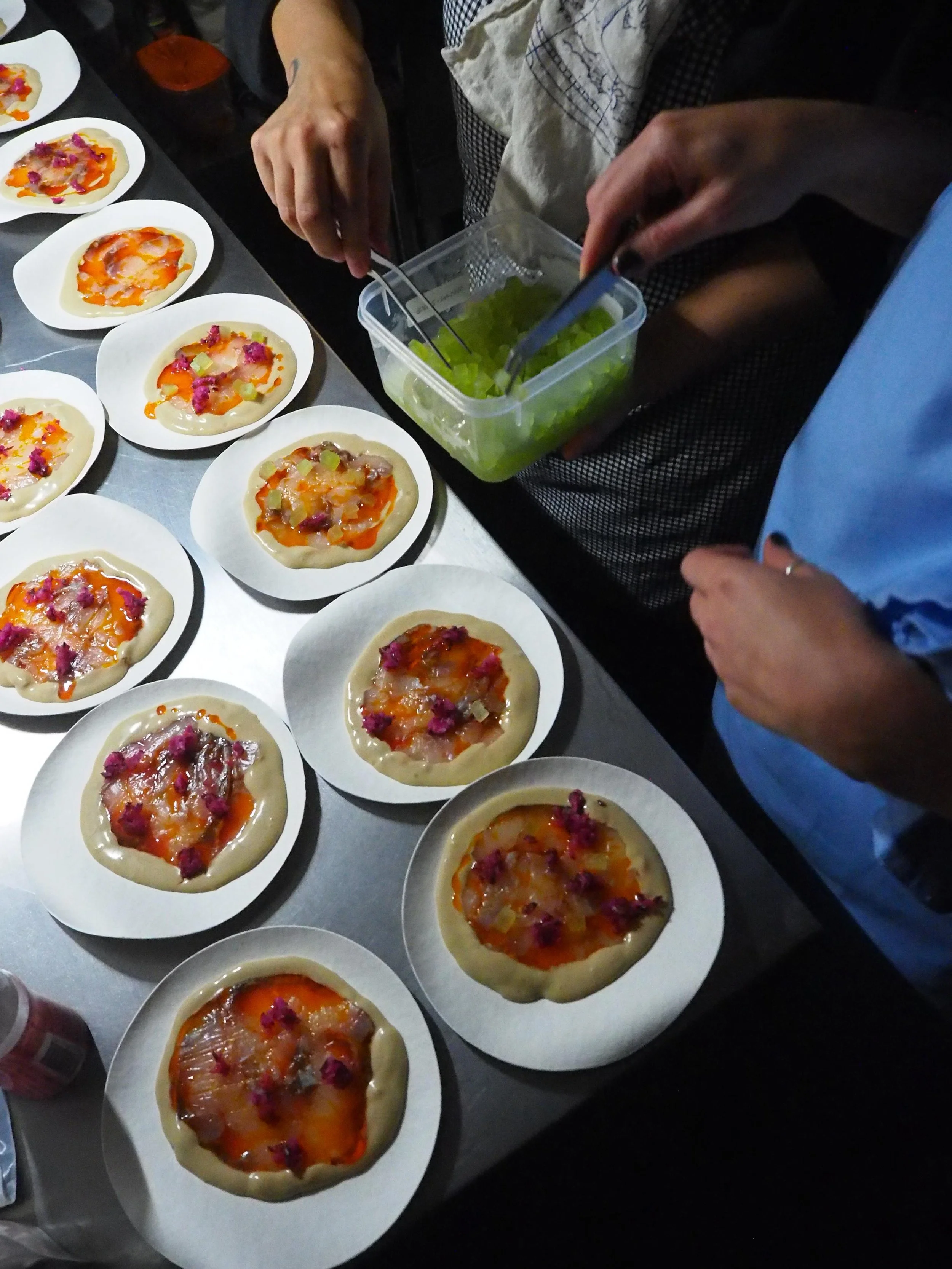 cauloflower potatoe + shoyu powder, brown pbutter, pine nutes; pea potate fria, pepperberry salt,