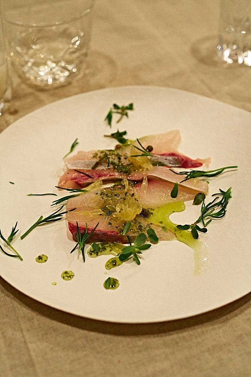 Kampachi crudo, shiso salsa, amanatsu, sansho, wild summer herbs